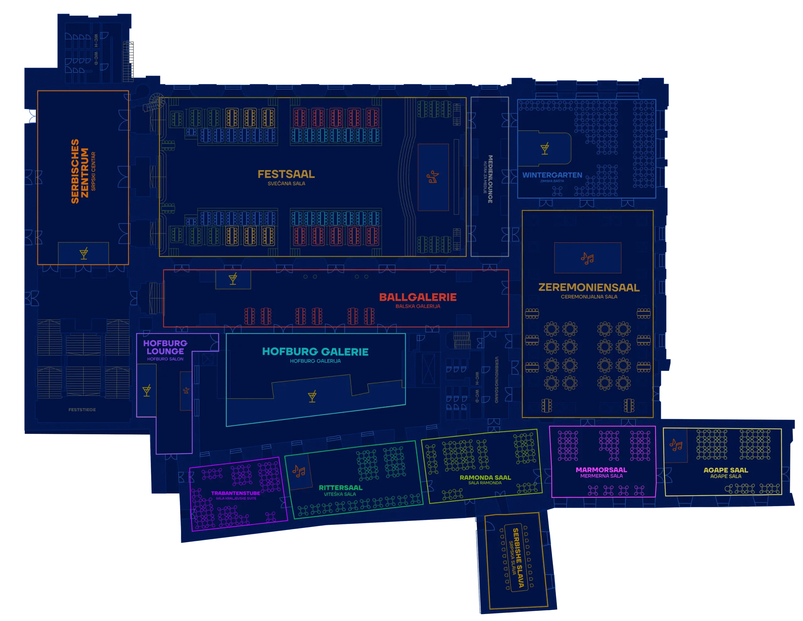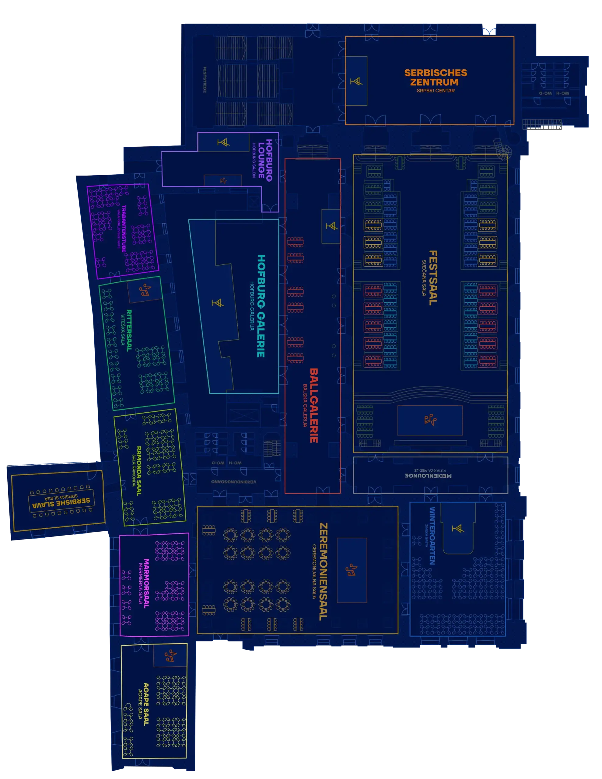 Куповином улазнице добијате приступ свима салама у којима се одржава Светосавски бал (Свечана сала, Церемонијална сала, Зимска башта, сала Краљевске Свите, Витешка сала, Мермерна сала, Агапе Сала, Српски центар, Балска галерија, Хофбург галерија, Хофбург салон, Сала Рамонда, Сала Гарде I и Форум).